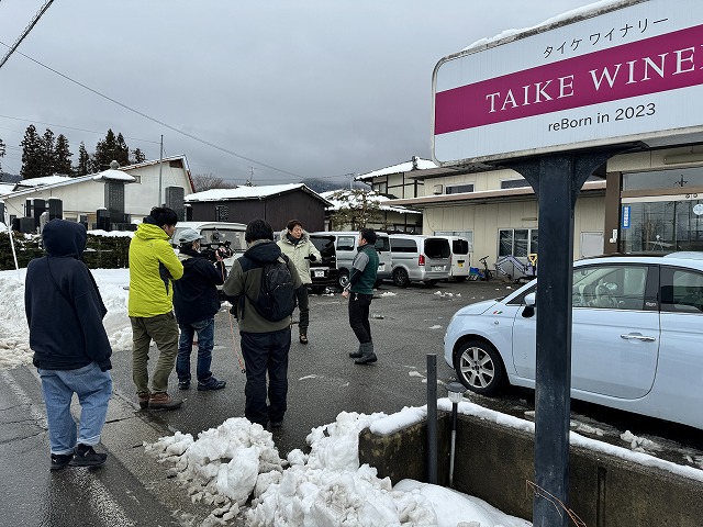 あいにくの大雪の中でしたが、かえって信州らしい冬の圃場の絵となりました。小林が圃場、ワイナリーの説明を行い、最後にテイスティングの撮影でした。ヤマソー好きの辰巳さんらしく、ヤマソービニオン・スパークリングを大変気に入っていただきました。