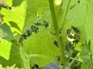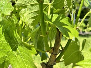 新梢は緑色で元枝と同じくらいの太さにもなっていますし、ぶどうのあかちゃんもちらほら出ていますね。