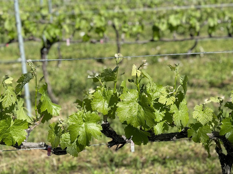 4月末までは、なかなか葉っぱも伸びませんでしたが、GWからは天気もよくぐんぐん枝も葉っぱも伸びています。ワイナリー前のメルローの圃場では芽かきを行いきれいになりました。