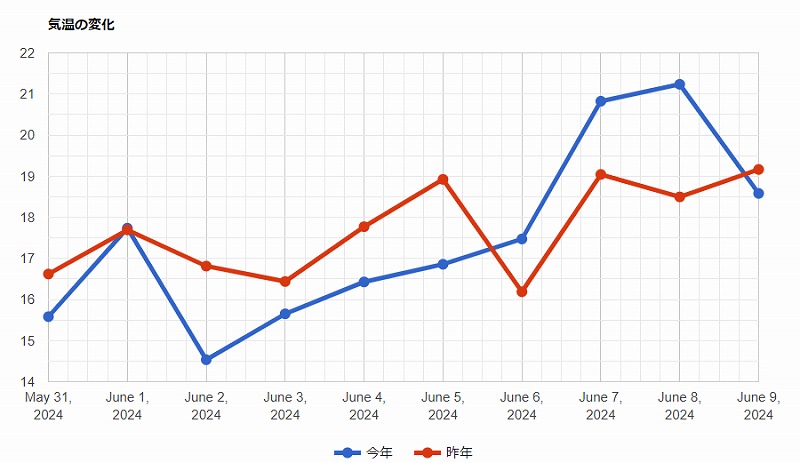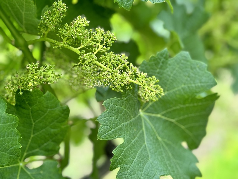 6月10日 メルロー開花 ワイナリー便り 2024.06.10 メルローの花が咲き出しています。花穂が成長して開花しました。 わかりますかねぇ、小さな小さな白い花です。目をこらさないとなかなか気づきません。もう少し経つと満開となって、実が育ちだします。 昨年に比べ気温の低い日が続いていましたが、ここ4~5日は温度が急に上がっています。