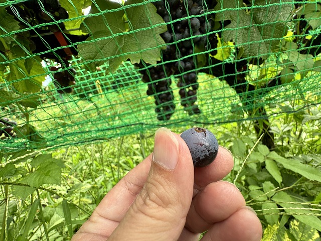 今年は昨年より気温も高く湿度の低いことから、ぶどうの成育が早く進んでいます。ワイナリー前のメルローも摘まんでみるとかなり甘くなっていました。