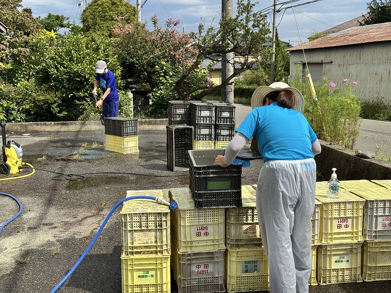 収穫にむけて ワイナリー便り 2024.09.20 収穫にむけて、採集コンテナの清掃を行いました。 収穫した房を入れる大切なコンテナです、きれいにしておかないといけません。 いつ頃からどの品種を収穫するかは、近々お伝えできると思います。 お手伝いさんを募集しますので、ご協力をお願いします。