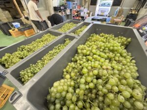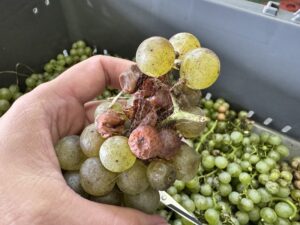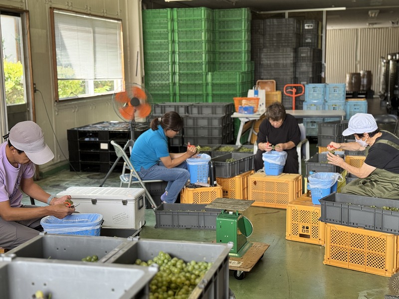 ソーヴィニヨン・ブランの選果 ワイナリー便り 2024.09.26 収穫したソーヴィニヨン・ブランの選果を行いました。 収穫されたブドウから、未熟な実、劣化した実、葉っぱ等、不要なものを取り除く作業を行います。この作業がおいしいワインづくりにはかかせません。 晩腐病になった果実は、赤く変色しています。 人海戦術でモクモクと選果していきます。