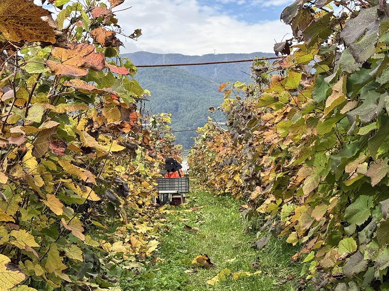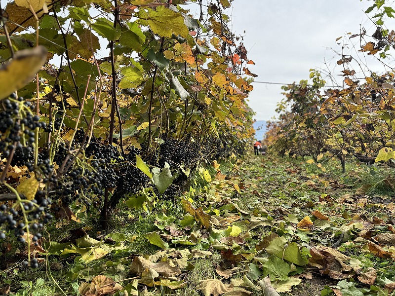 まだまだヤマ・ソービニオンの収穫 ワイナリー便り 2024.11.01 すっかり圃場は秋! ヤマ・ソービニオンの収穫を進めています。今年は例年の倍くらいの豊作で切り取る房が多いため、まだまだかかりそうです。 雨が続きそうなので、今日の午前中がんばりました。