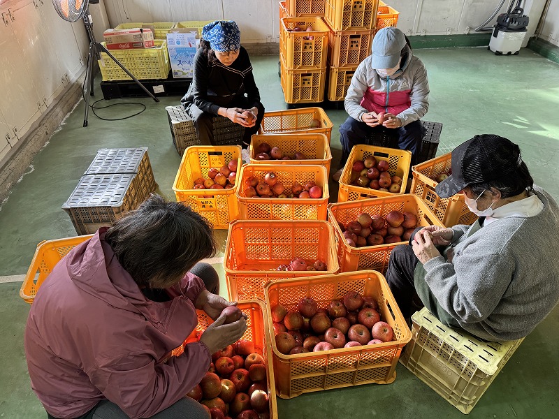 5人で作業したので、何十箱もあったリンゴも午前中で選果できました。りんごも鳥が突いて穴が空いてるものや、ひび割れしているものもあって、せっかくのリンゴもかわいそうです。そんなリンゴも傷んでいる部分をカットして、美味しいシードルにしなきゃ!と思います。