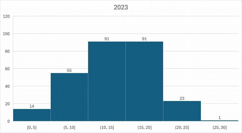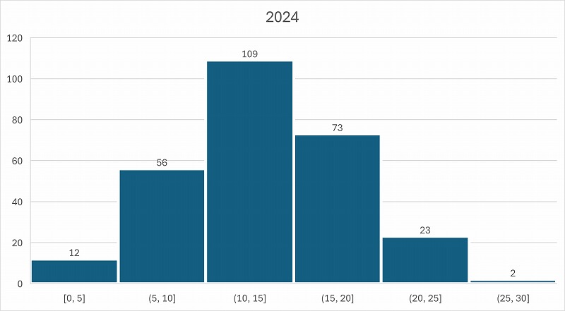 2023年、2024年とも一番多いのは、10~15度の日較差で、2023年は15度以上の日較差の日が2024年より多かったことがわかります。