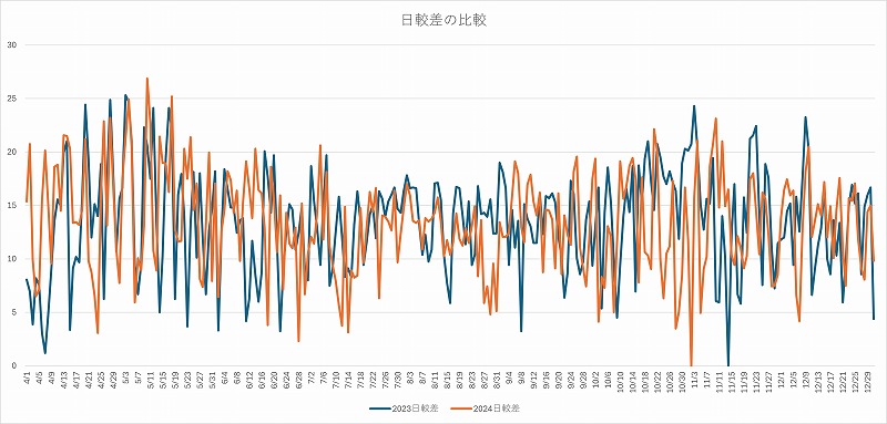 平均日較差は、2023年13.55℃、2024年13.37度。
