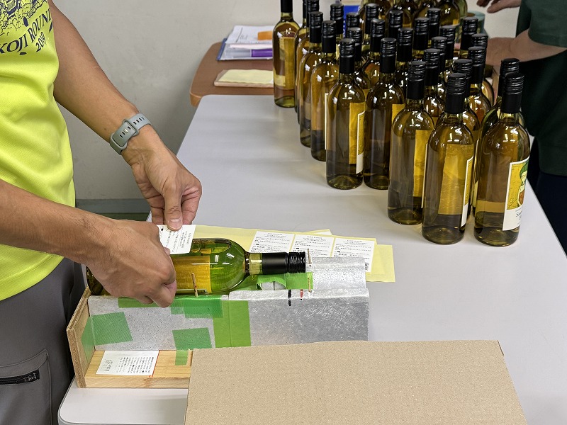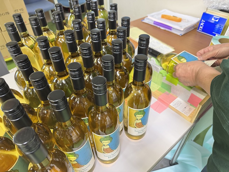ラベル貼り(SB) ワイナリー便り 2025.06.26 7月の出荷にあわせて、ソービニオン・ブランのラベル貼りを行っています。ご覧の通りの手作業です。ラベルの位置合わせのための治具は自家製、これがあると思った以上にきれいに貼れるんです。