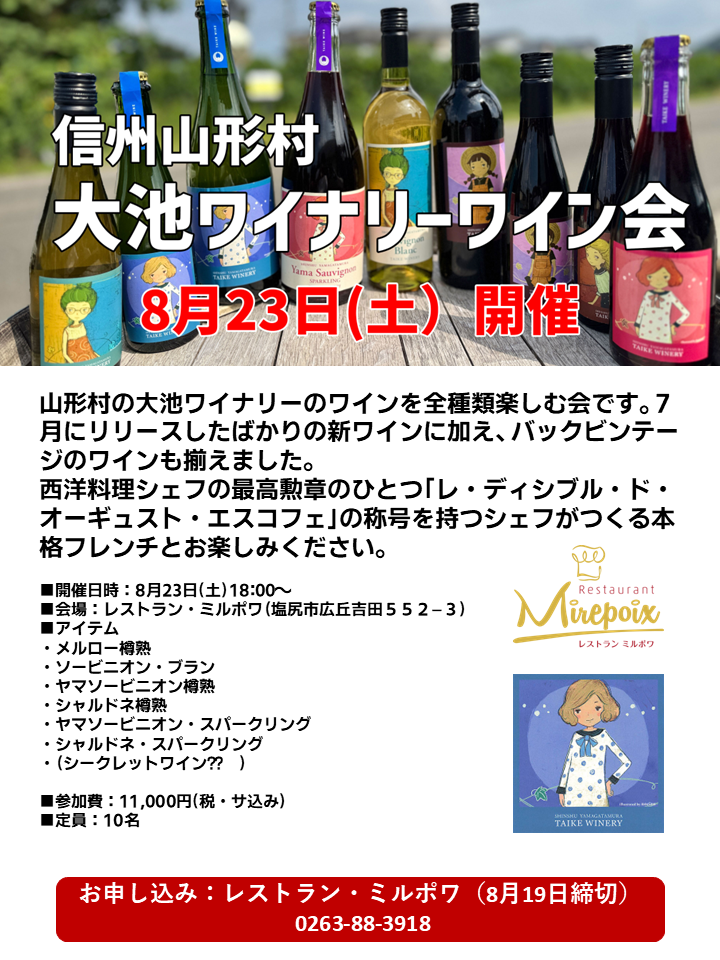 8月23日(土)に、塩尻市のフランス料理店レストラン・ミルポワでワイン会(メーカーズ・ディナー)を開催いたします。