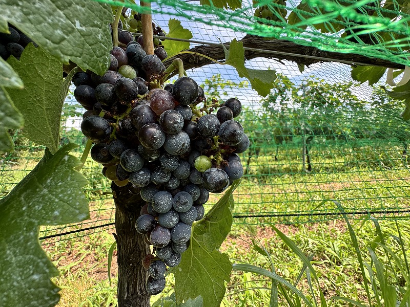 鳥よけのネット ワイナリー便り 2025.08.19 ブドウの実をすっかりと色づいてきて、絶好の鳥さんのターゲットです。 せっかく育てているブドウを守るために、各畑では鳥よけネットを張りました。 ネットをめくってブドウを見ると、ほら、こんなに立派に育っています!