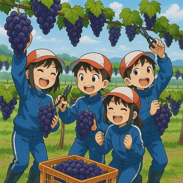ワイン用ぶどうを食べるのも初めてだったので、最初に食べていいよって食べさせると、「甘~い!」とびっくり、一気にテンションがあがります。2人1チームで収穫したぶどうを入れる箱を渡して作業をやってもらいました。