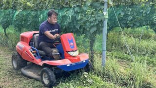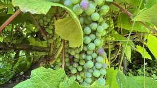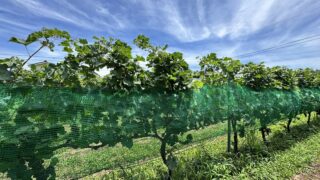 ワイナリー便り 鳥よけのネット ブドウの実をすっかりと色づいてきて、絶好の鳥さんのターゲットです。せっかく育てているブドウを守るために、各畑では鳥よけネットを張りました。ネットをめくってブドウを見ると、ほら、こんなに立派に育っています! 2025.08.19 ワイナリー便り