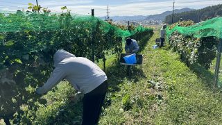 ワイナリー便り ピノ・ノワール収穫 秋晴れの元、ピノ・ノワールの収穫を行いました。昨年は10kgほどしか収穫できませんでしたが、今年はうまくいくと100kgくらいはいきそうです。これからワインにするのが楽しみです。また、この圃場は、西山斜面にあり、松本平らが一望できるきれいな... 2025.10.03 ワイナリー便り