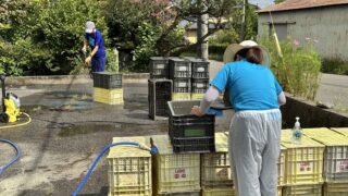 ワイナリー便り 収穫にむけて 収穫にむけて、採集コンテナの清掃を行いました。収穫した房を入れる大切なコンテナです、きれいにしておかないといけません。いつ頃からどの品種を収穫するかは、近々お伝えできると思います。お手伝いさんを募集しますので、ご協力をお願いします。 2024.09.20 ワイナリー便り