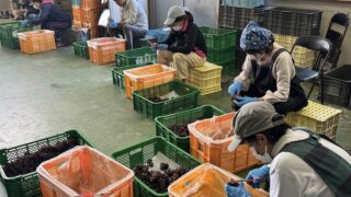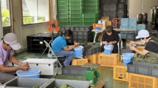 ワイナリー便り ピノグリの選果 今年から初収穫のピノグリ。糖度もあがってなかなかの出来です。昨日まで圃場でいっきに収穫して、今日からワイナリーで選果作業に入りました。もくもくとした作業ですが、みなさん目を皿にして傷んだ実を除いていっています。 2024.10.17 ワイナリー便り
