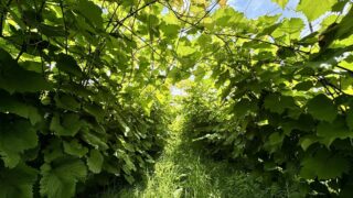 ワイナリー便り ヤマ・ソービニオンのトンネル ヤマ・ソービニオンの圃場の様子です。樹勢が強いので、新梢がトンネルになっています。これから日当たりを良くするために枝切り作業が始まります。ぶどうの実もかなり多くなっていますので、楽しみです。 2024.07.02 ワイナリー便り